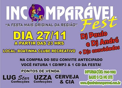 No próximo dia 27/11 sábado tem a Incomparável Fest na Boatinha do Clube Recreativo de Paiçandu, sob o comando dos DJs Paulo e André mais convidados. No ato da compra do convite antecipado, você ganha 1 CD/MP3 e 1 CD da festa.